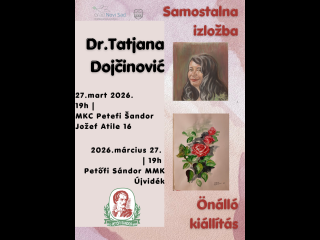 U petak 27. marta u 19 časova u izložbenoj sali Mađarskog kulturnog centra “Petefi Šandor” biće priređeno otvaranje izložbe dr Tatjane Dojčinović, koja će publici predstaviti svoj autentičan umetnički izraz kroz pažljivo odabrane radove.
